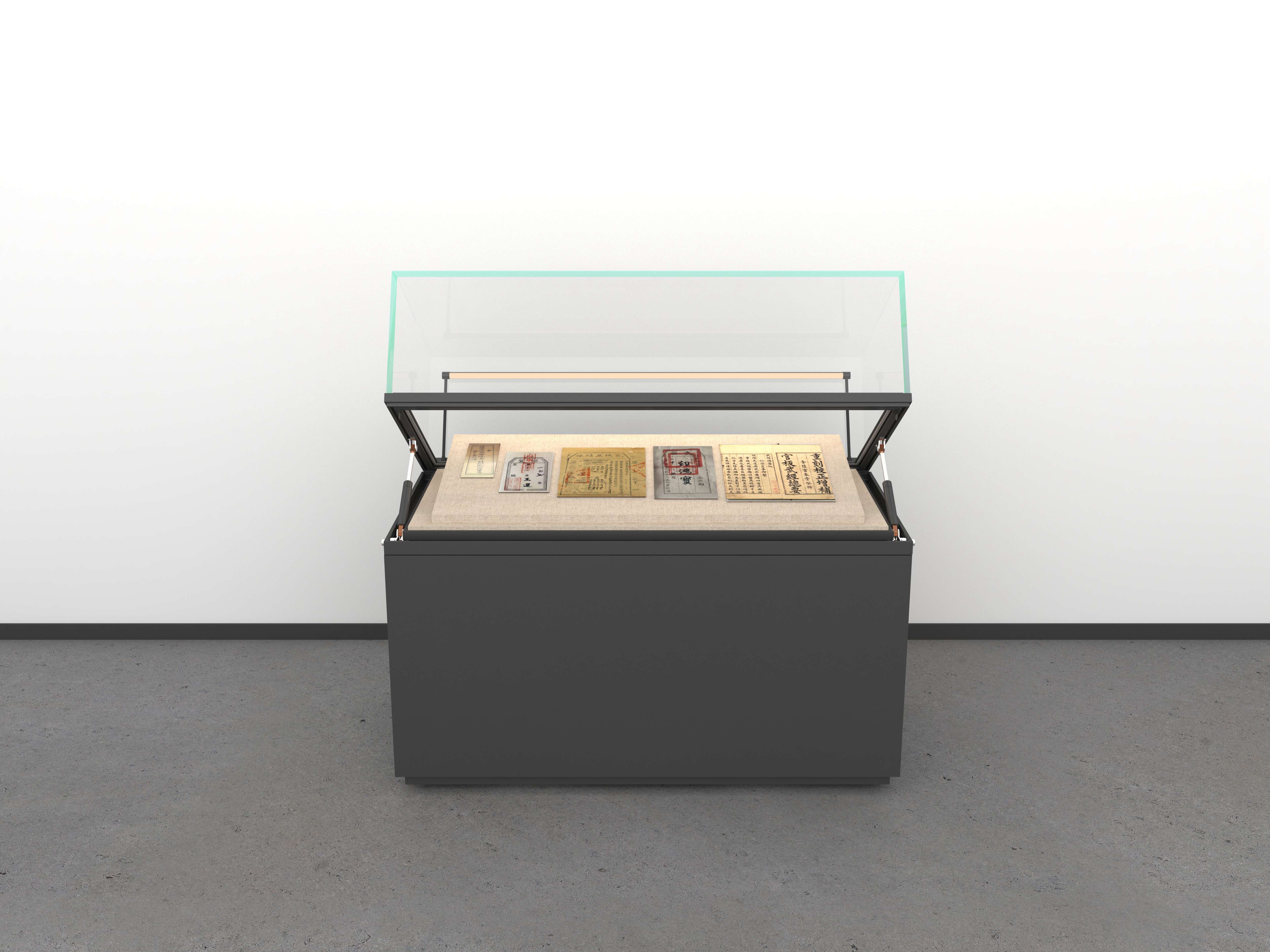 Table display case with 5-sided glass for 360° view, optional microclimate system, ideal for books, letters, textiles.